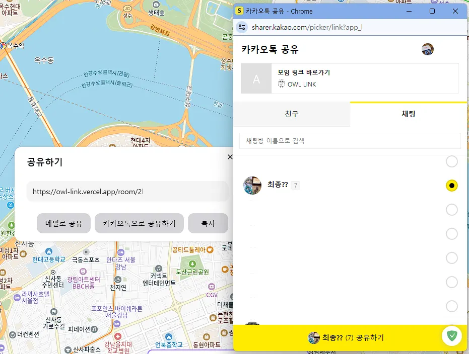 카카오톡 링크 공유 및 링크 복사로 빠르게 모임 인원을 초대해보세요.