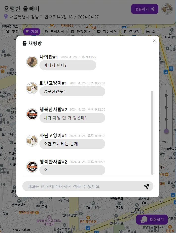 모임 방에서 다른 사람들이 일정과 위치를 등록하는 것을 실시간으로 확인할 수 있어요.
